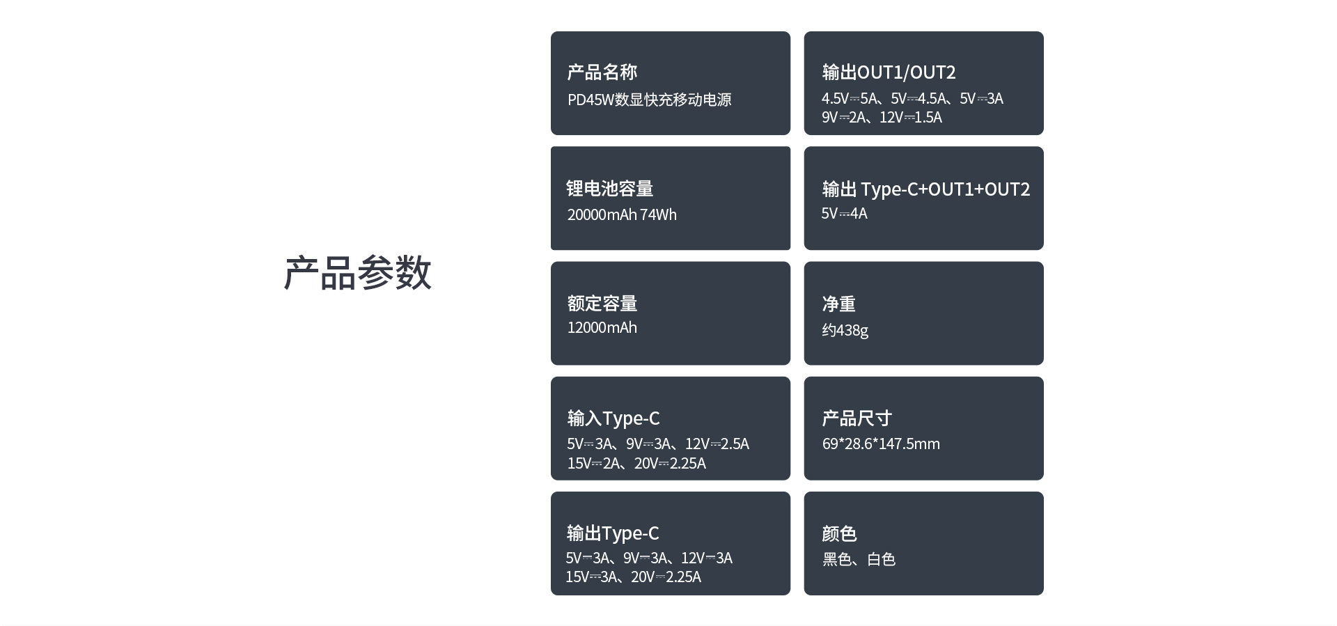 | 输出Type-C | 5V⎓3A、9V⎓3A、12V⎓3A、15V⎓3A、20V⎓2.25A |
