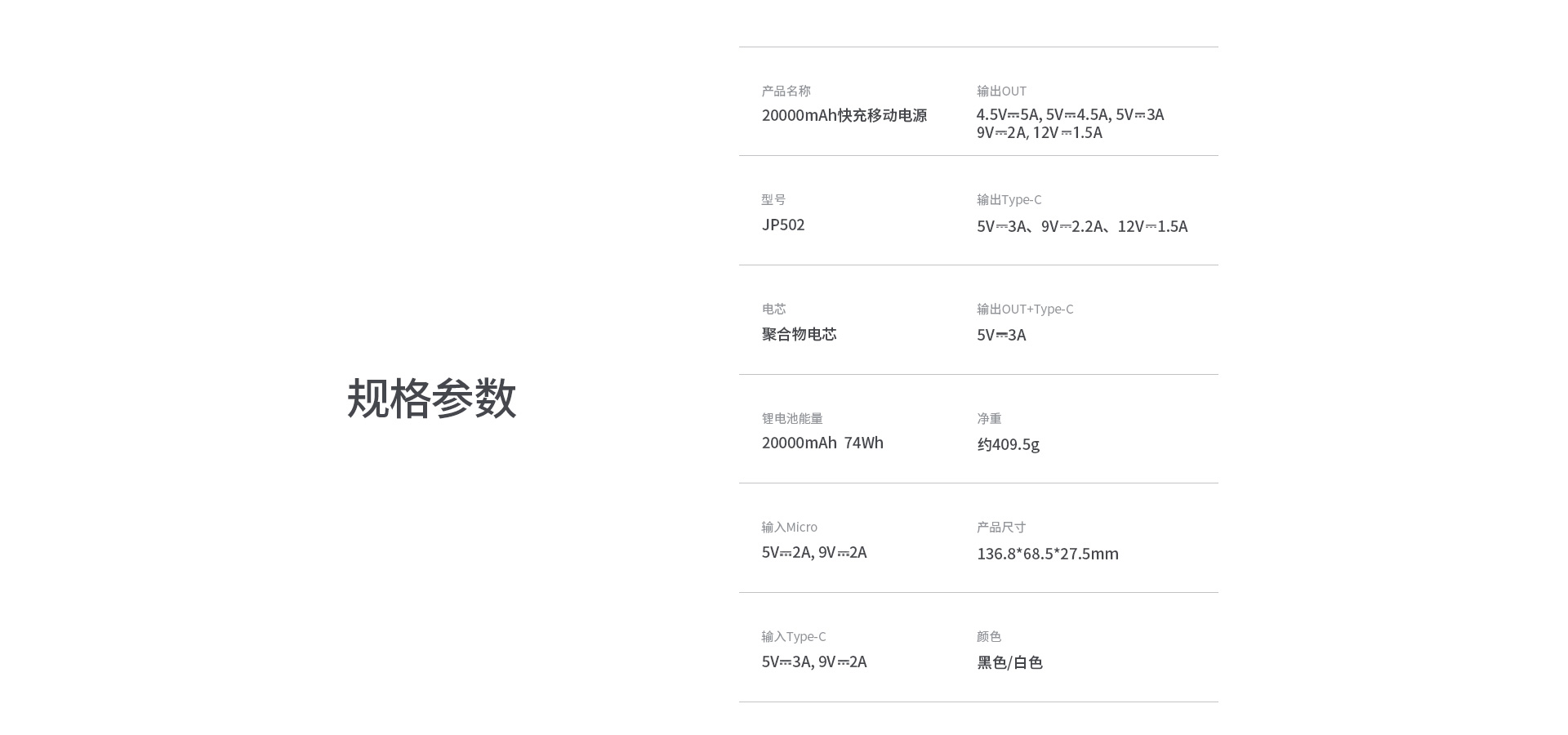 | 输出Type-C | 5V⎓3A,9V⎓2.2A,12V⎓1.5A |
