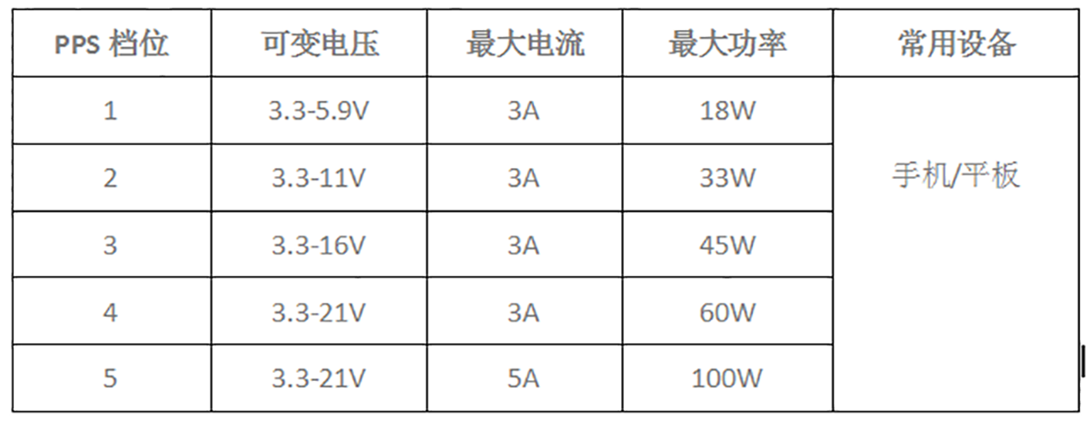 PPS 100W:20V 5A可变档位,最高功率约50-70W,如小米17系列表1:PPS快充协议常见输出档位