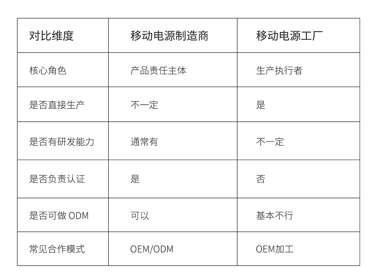 为了更好的区分移动电源制造商与工厂的核心区别,以下表格对两者进行详细的对比分析,希望能帮你快速区分!