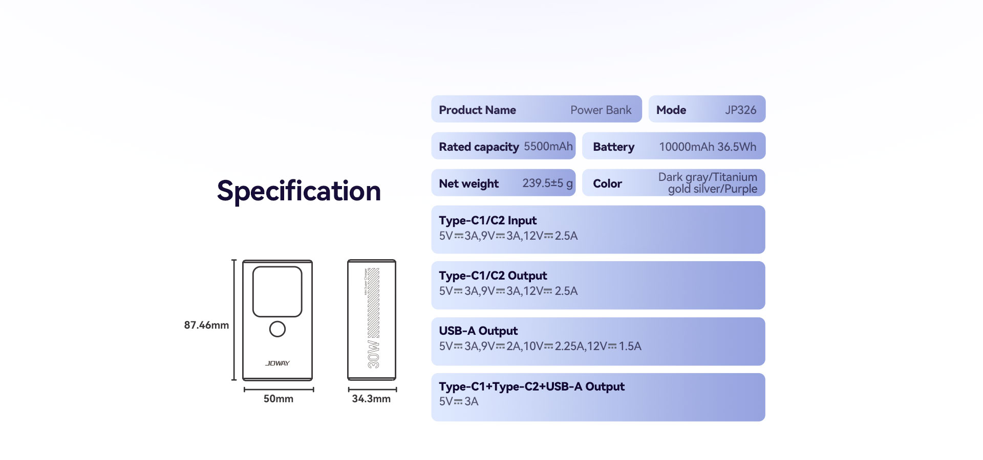 | USB-A Output | 5V⎓3A,9V⎓2A,10V⎓2.25A,12V⎓1.5A |